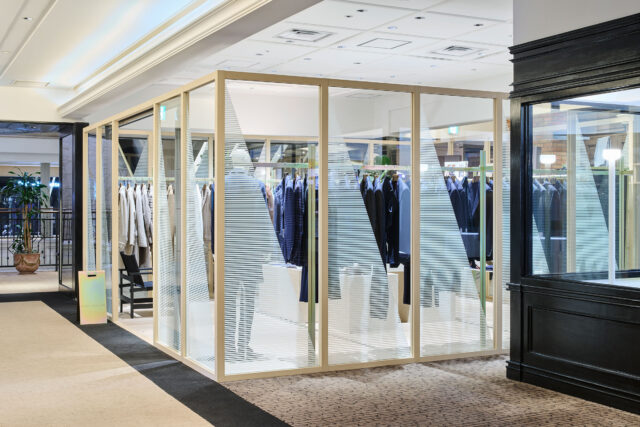 そうすることで、客同士の視線をずらしプライベート感を確保するのと同時に、様々な方向に向けられた鏡は、反射し合いながら映り込むイメージを増幅させる。