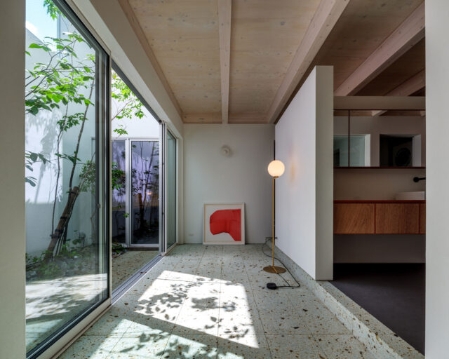 生活の器である内部空間は、都市の生活の中で失われつつある光や風、雨などの自然を常に感じることの出来る空間を意図した。そして、内外の空間が溶け合うような住空間が建築の内部だけで完結するのではなく、外部の街の空間と応答し合うような、そんな建築の佇まいを目論んだ。