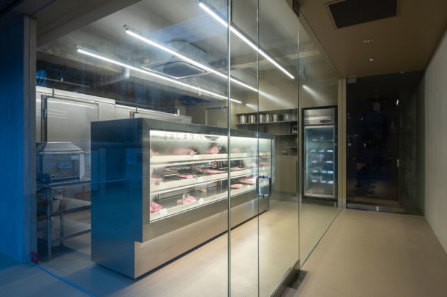 静かな住宅街にある寿司屋の計画。寿司屋におけるカウンターの重要性は言うまでもなく、このカウンターを中心としてお寿司や料理人を引き立てる、シンプルでニュートラルな空間を考えた。カウンターには一枚板のイチョウを使用、その背景に砕いたブラックスレート材を混ぜて研ぎ出したオリジナルのテラゾータイルを貼り込み、空間のトーンを局所的に引き締めた。タイルには研ぎ出す際の手跡を敢えて残し、テーブルスペースも同様にレッドスレート材を混ぜたタイルで背景を作った。そのほか床には長尺・無垢の米松材を、ファサードやパーテーションにはフロストガラスを用い、適度な死角を作りつつ、落ち着いて食を楽しめる空間を構成した。