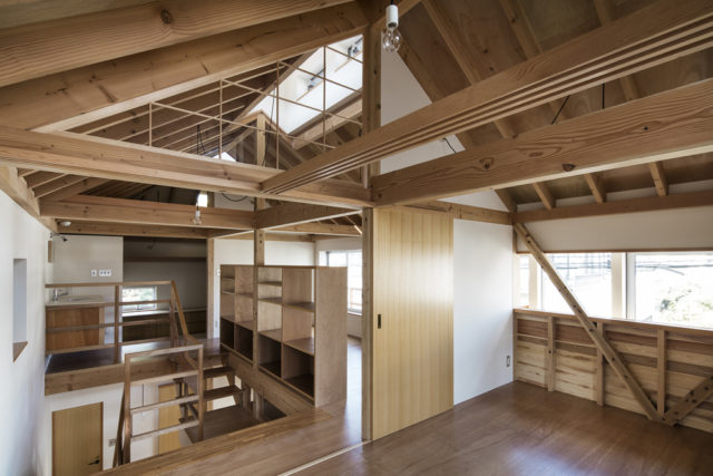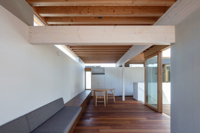 腰壁は1.6Mに設定した。1.6Mはちょうど人の背の高さ~目線の高さにあたる。立った時あるいは椅子やソファに座った時、外の風景は見上げる関係となる。これにより煩雑な風景があまり目に入ってこない。もちろん外からは内部の様子が見えずプライバシーが保たれている。水平連続窓の上には桁が走り放射状に連なる化粧垂木を受ける。高い「腰壁」と化粧垂木が、家族の居場所をおおらかに包み込む空間となった。