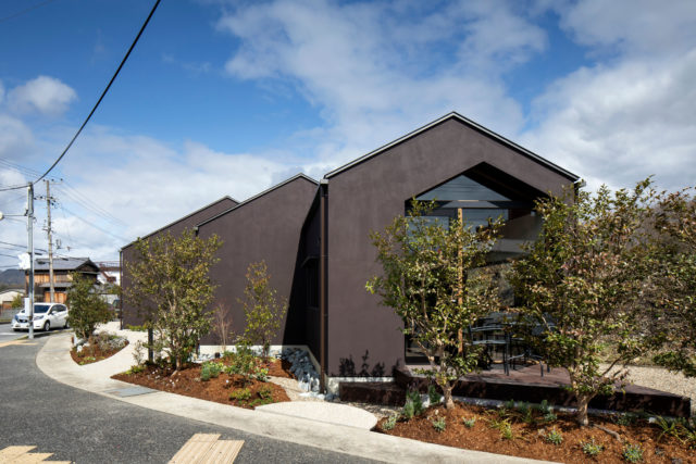 敷地は神戸市北区に位置する閑静な住宅地。道路から約1・5mの高低差があることとT字路に面しており南北の道路の抜けがあること、またA4シートに綴られたご夫婦の想いを元に計画した。モデルハウスとしての機能も持たせるため、来た人がワクワクするように、また愛猫サバとの暮らしも考慮し、回遊性と開放感を意識した。内部空間の間口は一間半とし、吹抜けやロの字に連続させることによりタテ・ヨコへの空間の広がりが実現。道路との高低差は駐車スペース確保の目的もあり法面を中庭まで引き込むことで、スムーズに家へと導き、また道路からの視線の干渉帯としての役割も果たしてくれる。南北に抜ける道路からは、南からの風を中庭に呼び込み吹抜けへと抜け、家中に気持ちイイ風をもたらしてくれた。