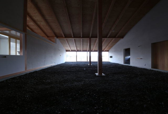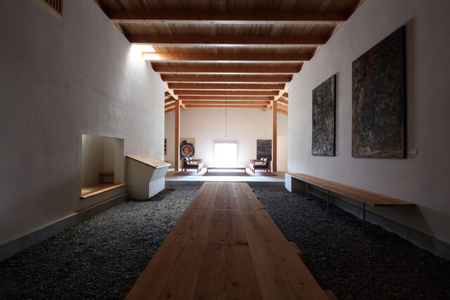 杉下均建築工房による、岐阜・関市の「後藤昭夫藝術館」。約15mの砂利敷の光を抑えた“羨道”のような土間を通り抜け、自然光での作品鑑賞がなされる展示部にいたる空間を構成