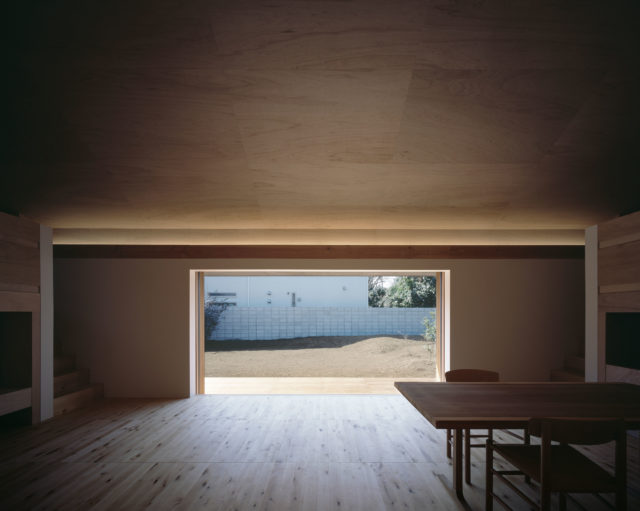 高さを絞り、南側からの光がグラデーションしながら落ち着く光へと変わる北側に水廻りを配置し、シンプルな平屋の矩形の中で気積と光によって空間が変化しながら連続する関係性を導くことで、時間と空間と生活リズムが流れるように繋がることを目指した。
