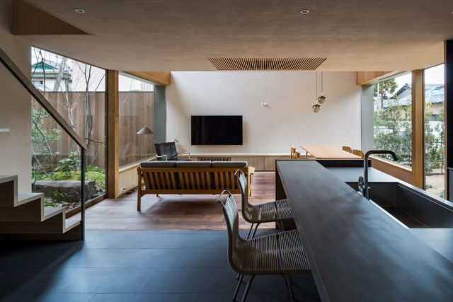 屋根は構造体がそのまま天井に現され、高いところでは4.4mの天井高となっているが窓の開口高さは1800mmまでにしぼって目線を低く庭へと誘導している。