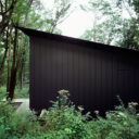 伝統的な瓦屋根を印象付ける複雑な棟は雨仕舞い上の弱点でもある。この弱点を克服するために溝型鋼を使用して棟を納めているが、重い印象になりがちな瓦屋根を現代的なたたずまいに落とし込むための工夫でもある。
