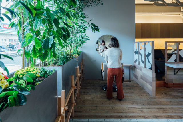 その雰囲気が宮大工の父が組み木で作り上げたフレーム、50角タイルが貼られたカウンターや厨房のレンガタイル壁などデザインされたディティールと対比されることで空間には違和感の隙間が所々に生まれ、