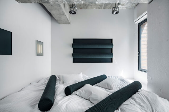 元木大輔 / DDAAによる、東京の、宿泊施設の部屋のインテリア「BnA_WALL Room 403 | 405 Framed Function」。宿泊費の一部が作家に還元されるプロジェクトに、デザイナーとして機能が“作品のように”振る舞う部屋を考案