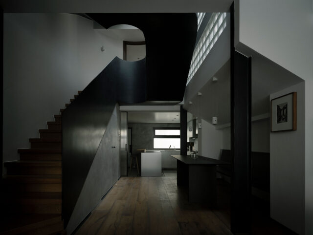 On the first floor, there is a guest room that drops down half a level to be approached from the kitchen, and a bar lounge that rises half a level to enjoy the view of the surrounding area.