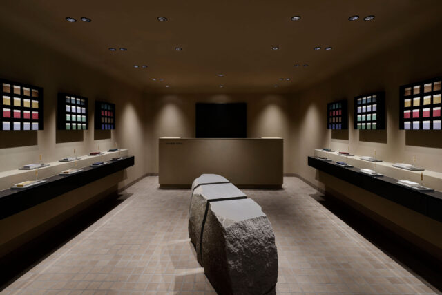 天井は消防法や空間としての奥行、モダンな素材使いによる影などの遊びを表現するため、廊下部分は矢羽根のような造形のステンレスメッシュを使用して方向性を感じられるものとし、個室には亀甲編みの銅網天井を二重に設置して、奥の天井への奥行や、窓から見える空が銅網を通して空間の一部となるように設えた。