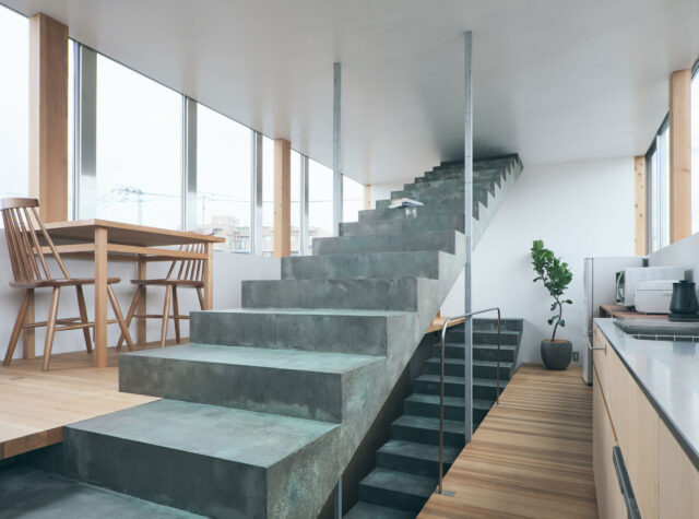 平面は、中央に外部階段を含む吹き抜けのをもつことで、南北に大きく二分割される。床はモルタル打設時に着色した粉を散布して仕上げたもので、モルタルそのものの色ムラを拾いつつ、表情が豊かなものとなった。