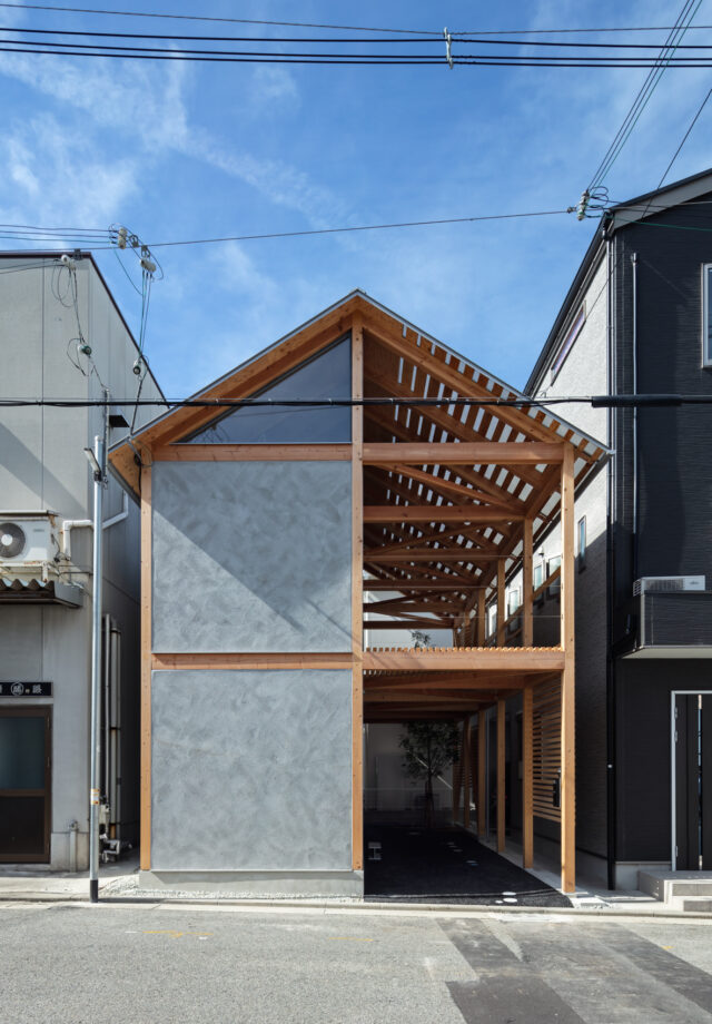 近隣の視線が気になりがちなひな壇造成された整形の住宅街において、プライバシーを確保しながら、通風、採光を確保するため、屋根を上下の二重屋根とし、上屋根から吊るされたイメージの外壁で四周を囲い、南側一部から路地テラスが内部へ入り込む構成とした。