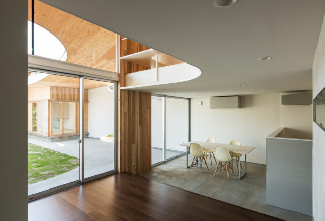 そして、この下屋根から頭を出した2階子供室からは、360°パノラマの景色を楽しむことができ、1階は路地テラスを通じて各部屋がつながり視線が抜けることで、解放感がもたらされる。