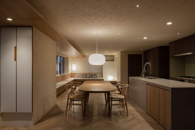 計画地は住宅街ではありますが、5層程度のマンションや大学、飲食店が混在しており、幹線道路から1本入った通りに面しています。RCの壁構造で無理のないスパンの複数のボリュームで構成しており、内部は1.5層程度の吹き抜けたピアノの置かれたリビング、対比的にスケールを落とし木の梁を並べたダイニング、土壁の和室があり、キッチン・水回り・WICは裏動線からもアクセスできます。ゾーニングとプランニングできっちりと要望を処理しつつ、大きな要望であったピアノをリビングに置くために、天井の高低や彫り込んだ床、照明等を工夫しています。