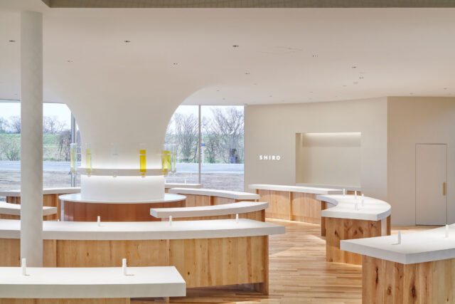 メインエントランス側の物販用カウンター、奥のカフェカウンターは自然素材をベースとした白い左官材で仕上げ、中央にSHIROの発祥の地である北海道のナラ材を使用した什器を設置。