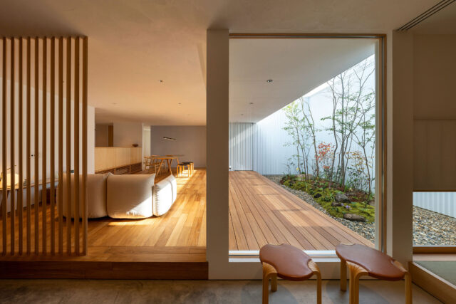 The joints are equally set at the mortar walls, and the wall is design to feel in a way that, at a glance, there is a no doorway, but a hidden door. The ratio of the whole space is equally set in 70% intervals, having a regularity, the atmosphere of feeling in Japanese good old days architecture is expressed.