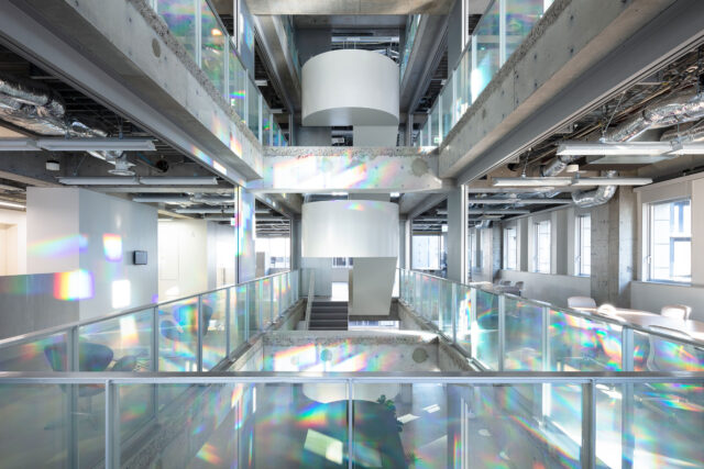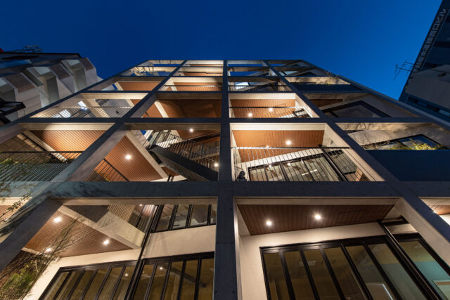 The black wooden structure covers and hides the surrounding skyscrapers that did not exist in the early Showa period, and the countless rays of light flowing through the holes of the structure blends with the sunshine throughout the leaves. As the modern scenery is revealed through the trees disappearing, and the strong sunshine of the summer softens, the visitors share the same ancient time that flows within the garden. The jet black structure is the cool shadow that floats in between the old trees on a summer evening.”