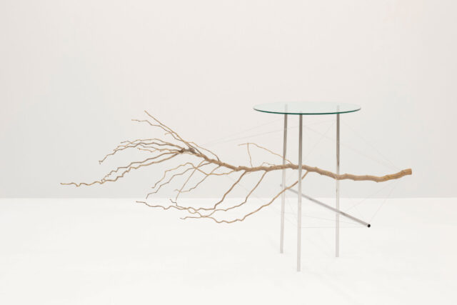 具体的には、20mm厚の透明アクリル板を相欠きし、組み合わせた上でベルトで固定することで使用できるようにデザインされている。実用性の側面を見れば、組み立て分解が容易で誰にでも出来ることがあげられるが、そのような実用性だけではない元木の美学が詰め込まれた作品だと言える。透明なアクリルは視線を透過すると同時に周囲の景色を映しこむ。そこに元木によって見出された黒色のベルトと固定用のパーツが組み合わされることで、非常に引き締まった印象を与える。