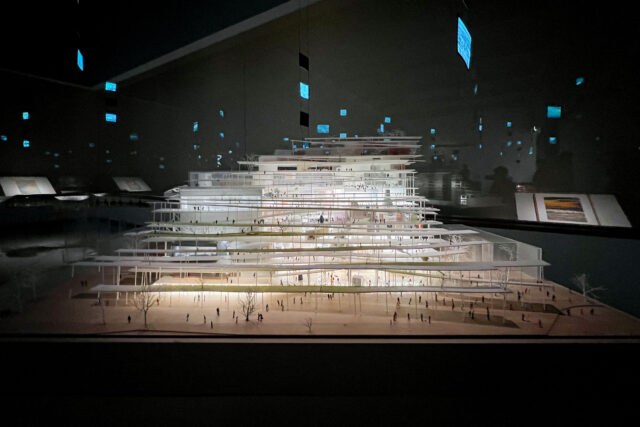木材を三次元カットして組み合わせる、日本の最新技術を生かした建築が、力強い物質感と工芸品のような緊張感を持って立ち上がり、都市の中に様々な文脈を引き寄せる、孔のような場所が生まれるでしょう。また、この設置場所は、パビリオンのもつ「多様なものが共存する」というテーマとも共通します。