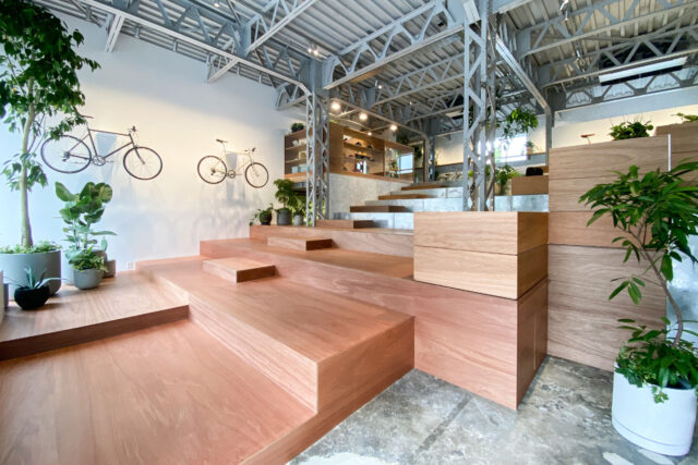 The interior plan for “TOKYOBIKE TOKYO” which was opened in Kiyosumi Shirakawa as the flagship store for the bicycle brand “tokyobike”. In addition to the flagship store, we renovated the 58-year-old steel-framed warehouse to a three-floor building to accommodate the tenants for the first overseas store of “The Plant Society” and the stand of the roasters shop “ARiSE COFFEE ROASTERS.” The large space in the warehouse welcomes not only bicycle fans but also people with various purposes.
