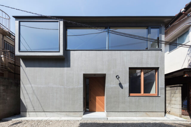 1階はエントランスホールと執務室とゲストルームを合わせたようなセミパブリックスペースが水平方向/X軸、Y軸に変化しながら(時に飛び出しながら)計画されている。そして、建物北側で垂直方向/Z軸に延びる吹抜けを通して2階へと繋がる。Z軸に変化し続ける2階もまた、室名を与えるのが難しいベッドとミニキッチンとダイニングテーブルとバスタブが置かれたプライベートスペースにおいて、床材をフローリングで統一することで、それらが共存可能な空間をつくりだしている。開口部は、南側はもちろんのこと、朝陽を取り入れるためと、周囲の景色の抜けの良さから東側を主としている。