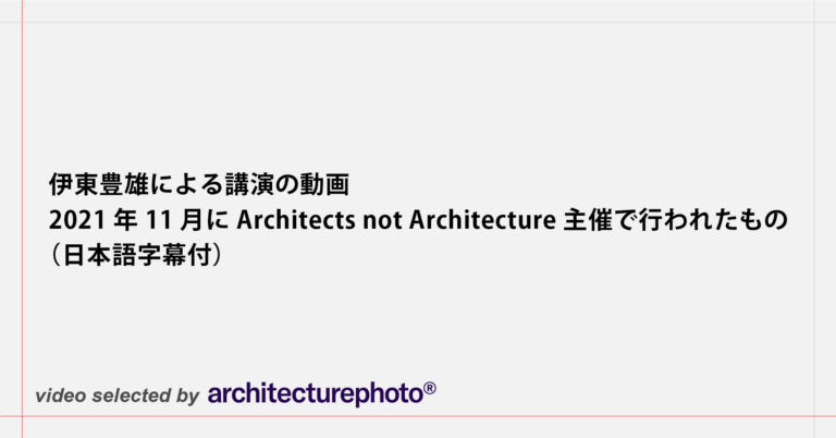 伊東豊雄が、2021年11月にArchitects not Architecture主催で行った講演の動画です。日本語でプレゼンテーションされたものが英訳されるスタイルで行われています。Architects not Architectureは、建築ではなく建築家自身を語るイベントとして知られていて、様々な建築家の講演を企画しています。