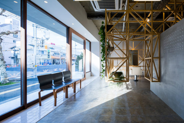躯体壁面部分に付随させて空間を時計回りに周回するようにエントランスから窓台部分を含んだ長い待合ベンチ、お客様にドリンクを提供するカフェカウンターへと続き、奥部分にシャンプーブースやトイレなどのインフラ部分をまとめている。