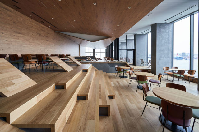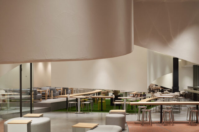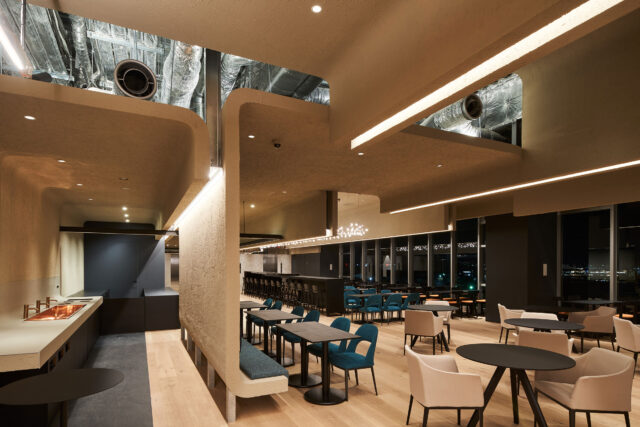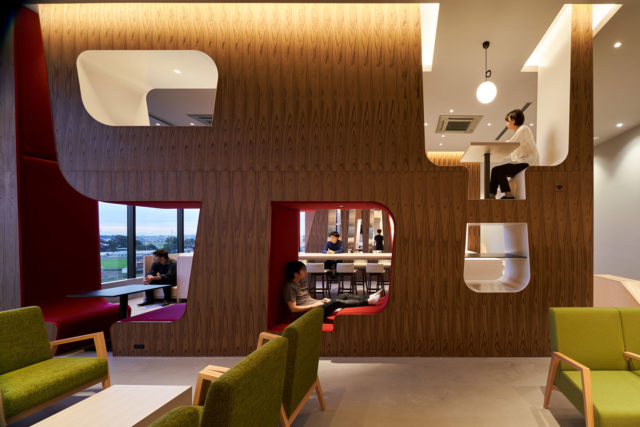 円弧を重ね柔らかい印象をもたせた段状の空間は、身をゆだねるきっかけを作り、その中にカウンター、小上がり、掘りごたつなど様々なシーンをスパイスのように効かせることで自分だけの居場所探しができるようになっている。また、この円弧空間は、自ずと中心に体を向かせる求心性を持ち、休憩時のコミュニケーションを促すだけでなくセミナーや会議などの利用にも適したものになっている。