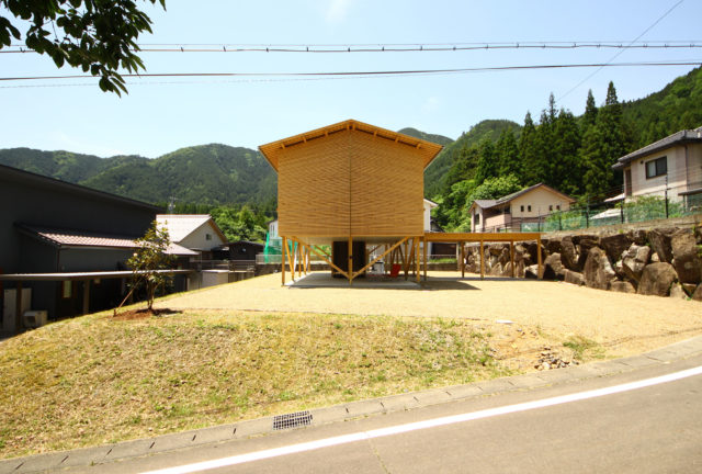 ファサードは各層で異なり、ポリカーボネート波板、ヒノキ30×40mm角材による格子壁、アルミサッシとし、ヒノキ格子壁をほかの層へ越境させることで、日射遮蔽と視線の制御をしている。この格子壁は未経験の住人が施工しているが、簡易かつ綺麗につくれるようガイドとなる治具をレーザーカッターでつくり、ひとりで500本程度の木材を取り付けた。