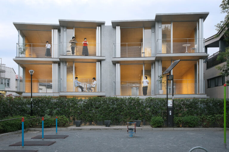 SHARE 赤松佳珠子+大村真也 / CAtによる、東京・港区のテナントオフィス「ROPPONGI TERRACE」。床面積確保と住空間の様に快適な事務所との要望に、地上階での採光等を考慮し公園側に開くようスラブを傾け積層、天井面を滑るように光風が室内を抜ける“テラスのような建築”をつくる
