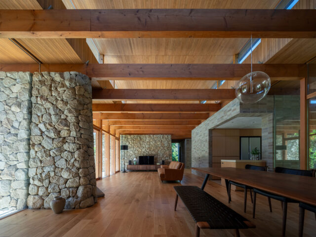 村上康史建築設計事務所と林直毅による、神奈川の「鎌倉山の住宅」。緑豊かで住民コミュニティが残る高台の住宅地が敷地、建物両側に公と私の性質の異なる庭を設け内部土間で繋ぎ縁側的な半公的な場を計画、近隣との関係を紡ぎ屋内外へ広がりある暮らしを構想 image©村上康史建築設計事務所+林直毅