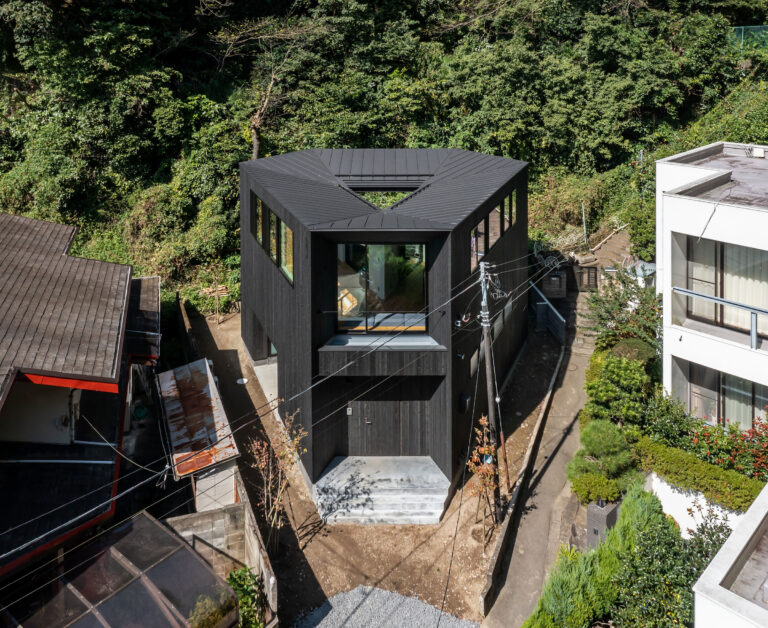 三輪直樹 / FUDOによる、神奈川・鎌倉市の、設計者の自邸「Yamanone no ie」。地域特有の谷地形“谷戸”の台形旗竿地に計画、地形から削り出た様な在り方と山の連なりに寄り添う構成を志向し各要素を設計、内外が織り交ざる多様な居場所を持つ空間を作り出す image©FUDO