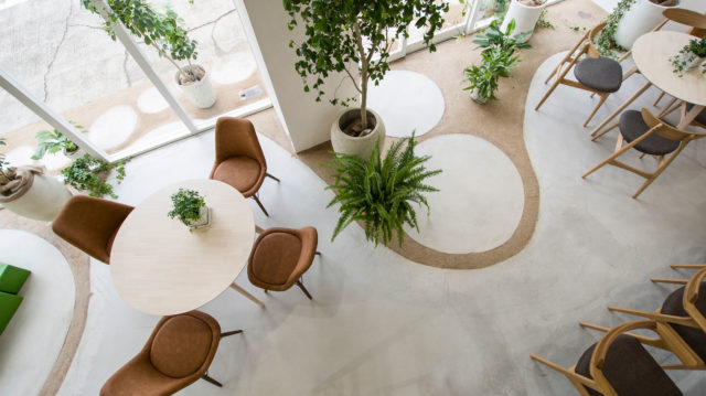 森岡寿起 / SO-ANによる、兵庫・神戸市の店舗「NUTS LAB」。歴史ある企業が創業地に新業態店舗を作る計画で、ラボ併設型でコンセプトの“化学”を表現する為に無機と有機の異素材を組合せ設計、厨房をオープンとしてライブ感を価値として提供 photo©山田圭司郎
