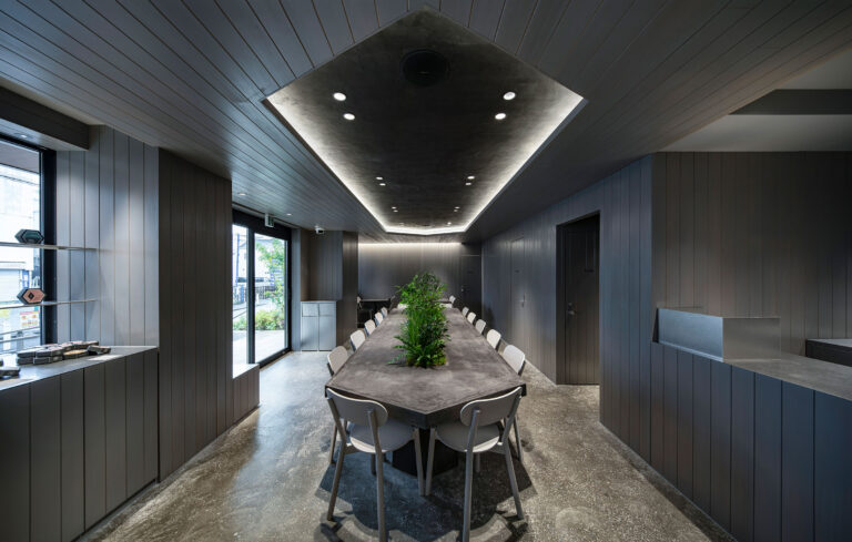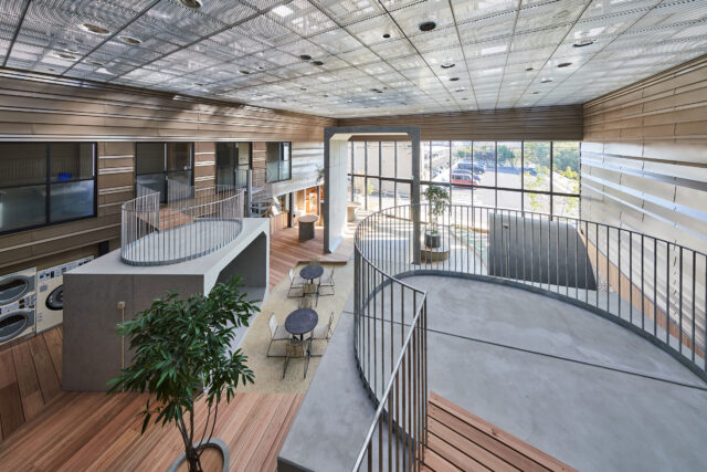 6. 竹中工務店による、東京・新宿区の「スガ試験機 本社ビル」。物性の経年変化を再現する試験機等をつくる企業の社屋で、その製品を“時間の移ろい”として解釈、各素材の選択や旧社屋の素材転用を通して企業アイデンティティの表現と豊かな空間体験を目指す