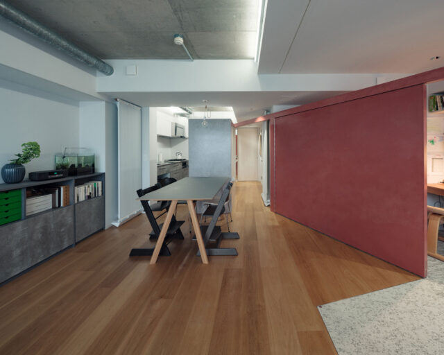 伊原慶 / TA+Aによる、東京・目黒区の住戸改修「まわる住まい」。都心の居住最低限の床面積の物件を選択した家族の為に計画、動線や収納等を極限まで削ぎ落とす作業から設計を開始、一部が可動する斜行壁を考案し諸室を緩やかに分節し日々の変化に応える