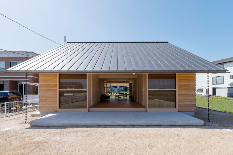 SHARE 木村智彦 / グラムデザインによる、鳥取・東伯郡の「田後のアトリエ住居」。長閑な環境に建つ作家夫婦の為の住宅で、長い時間を掛け育っていく“素”の状態の建築を求めて素直な形・簡素な素材・素地仕上げの建築を志向、加えて大屋根と大気積居間が安心感と求心力を生み出す