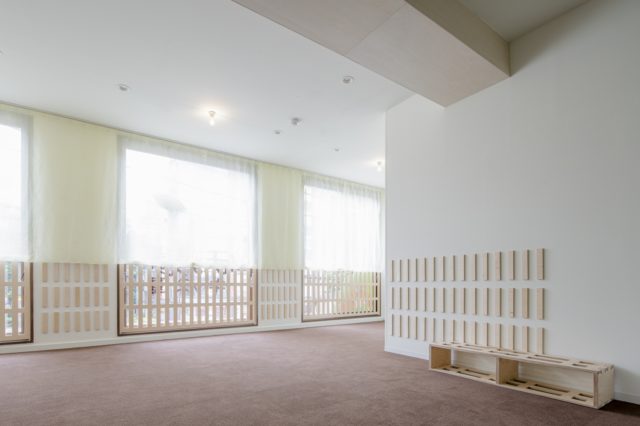 同じような色合いで統一しているカーテンも、縫製や素材を変え、場所ごとに振る舞いを変える。また、内部の壁や天井は白を基調とし、カーテンやカーペットによって窓や室内からの光を拡散・彩色させ、天気や時間の移ろいの感度を上げる。