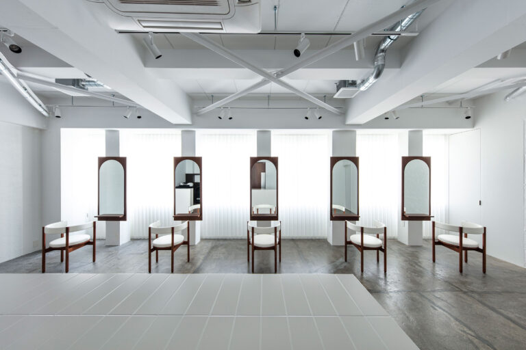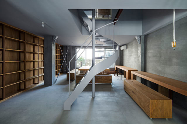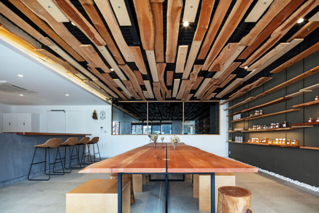 床には全長4m 高さ82cmの大きなミズナラ材のテーブルとハイチェアを部屋の中央に設置して室内の回遊性を確保した。また、テーブルの天板面は材をルーバー状に並べ、複数の樹種で造られた四角型と丸型の天板プレートを使い方に応じて配置する形式を採用している。壁には50㎜幅のホオノキ材を濃淡のグラデーション状に並べた背もたれ1.8mのベンチを取り付け、天井にはブナ丸太の表面をかつらむきにした薄さ0.6mmの突板によるランプシェード吊るした。辺りが暗くなると木目を通した柔らかな拡散光が街並みの中で優しく浮かび上がる。