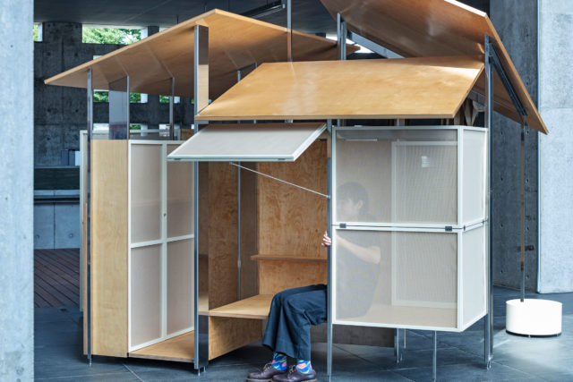 我々は床や壁の仕上げに木材を採用する一般的な活用方法ではなく、「小さな材によって構成された大きな造形を配置する」ことで、広葉樹の存在が積極的に空間の在り方に関わり、時間帯や利用者の創意によって様々な使い方が可能な多目的空間を目指した。広葉樹を表面的な情報としてではなく、具体的に触れて使ったり、他の人が使っている様を目撃したりする経験が、効果的なPRに繋がると考えた。具体的には、部屋の床、壁、天井にそれぞれ大きな3つの什器を設置し、什器以外の部分は既存のコンクリートと同系色であるグレーに統一した。