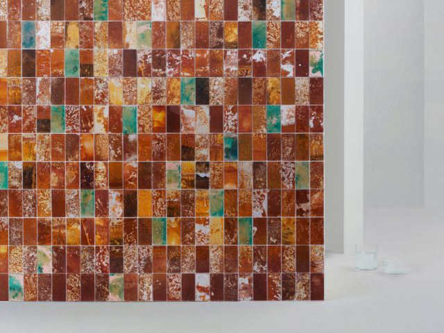 そんな狩野氏の代表作「Rust Harvest|錆の収穫」は、錆びた金属板から錆のみをアクリル樹脂に転写する斬新な手法を用いた、オリジナルプロジェクトです。日光・雨・土・海水などの自然要素を用いて自身の手で金属板の錆を育て、そこから錆のみを剥がした金属板を再び錆びさせて、新たな錆を作り出す。まるで農作物を生産するサイクルのように錆の模様を“収穫”していきます。