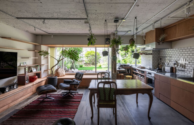 地上階の庭付き住戸に手を入れる計画です。建築家は、文脈を活かした“新築にない”価値の創出を求め、既存外壁と同じタイルの内部への使用等を実践しました。また、空間に複数の役割を与え境界を無くして多様な居場所を作る事も意図されました。