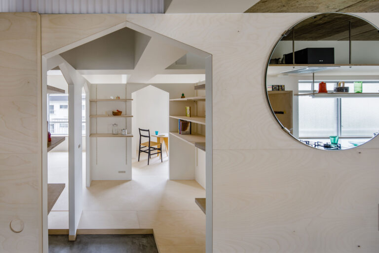 阿曽芙実建築設計事務所による、兵庫・神戸市の「鶴甲団地のリノベーション2」。団地を賃貸住戸に改修。小空間への可変性の付与を目指し、中心の“コリドー”が各部屋との接点を作り建具の開閉でも様々な使用が可能な構成を考案。その時々に求められる“距離”を作れる仕組みを設計 photo©大竹央祐