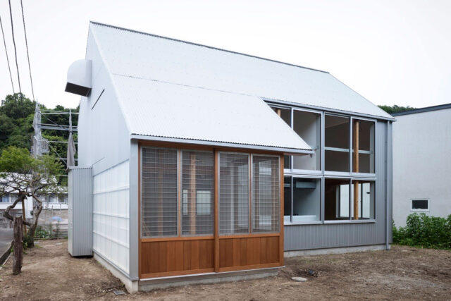 “作陶”を行う施主の為に計画されました。建築家は、“外部を選択的に取り入れる皮膜”を主題とし、高窓採光を実現する“卍型”に回転させた“ギャップ”を持つ屋根を考案しました。また、“選択的な透過性”の空間として通気等の機能も備えています。