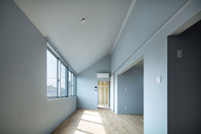 7. 村上康史建築設計事務所と郡司圭による、大阪市の「新森の住宅」。住宅地の細分化された敷地。周辺の駐車場や庭等の“余白”の援用を求め、高さ“6.5m”の空間を家の中心に据えて“周囲の余白と紡ぐ”ように開口を配置。限られた条件下で外部環境を享受できる在り方を示す