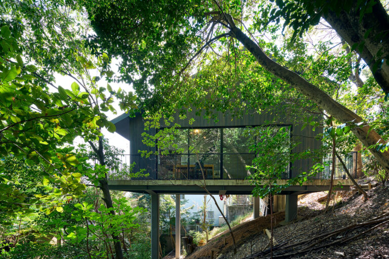 SHARE 桐山啓一 / Airhouseによる、愛知・名古屋市の「八事の家」。自然に囲まれた急傾斜の敷地。平地の無い状況での合理性も意図し、4本の鉄骨柱で支えるRC床の上に“木造の家”が載る構成を考案。木々と床の高さの関係を検討して“森に浮遊する”様な住環境を作る