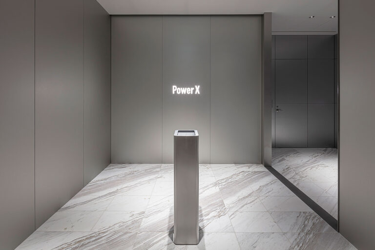 打放しのパネル割りにも用いられた1050mmグリッドの写しとして什器寸法を設定した。天板表面にはスカーフを引き立たせ、かつコンクリート躯体も引き立たせる素材として、軽さと硬さを感じる、ホワイトとシルバーのメラミンを使用している。また人の手に触る、座る、身体的スケール感を感じる箇所には経年変化しやすいラワンベニヤを用いた。硬いグレーのコンクリート壁と柔らかいタイルカーペットの床の間にあるカウンターの扉には、相反する質感を調停するスピーカーサランを用い、また対面に立つ大理石の壁の質感とも向き合うこととした。表面のチューニングを通じて、硬さと柔らかさが同居した建築が生まれた。