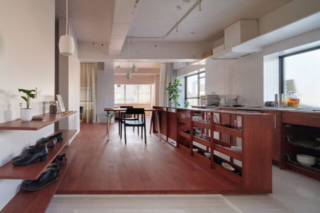 階段まで伸びる各スペースの床仕上、リビングに伸びソファ化する踏板、階段が収納や玄関といった別の機能を兼ねること、常に階段の先に別のスペースが垣間見えるような構造や踏板や家具の在り方。