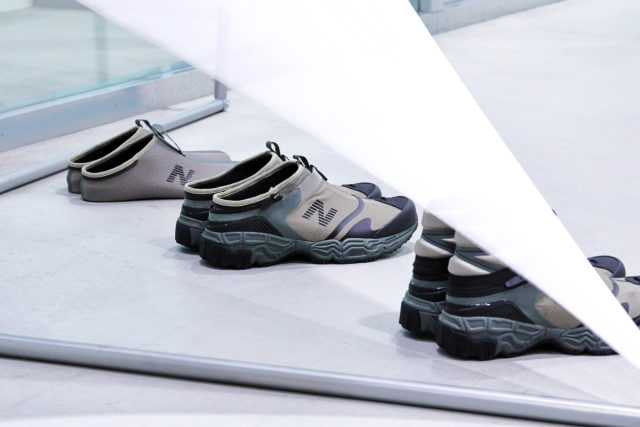 フットウェアはトレイル(未舗装路)ランニングシューズが原型ということで、水平面を設けず傾斜にそのまま陳列した。