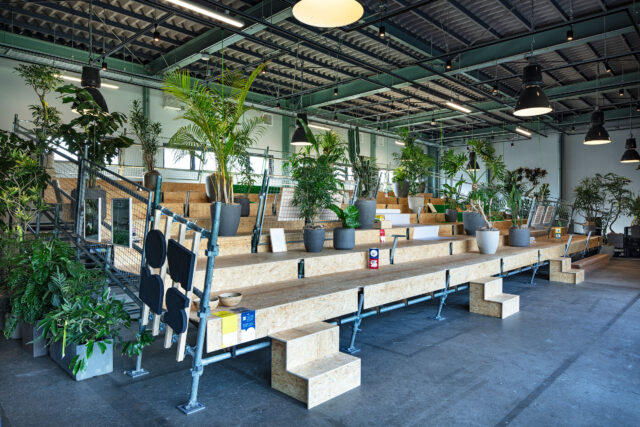 SHARE 坂本拓也 / ATELIER WRITEによる、東京・銀座の、商業施設内のディスプレイ「TDS New Balance SS23」。“ジェンダーニュートラル”を謳うブランドの為に計画。性の区別なく“サイズピッチ”が変わる製品特徴に着目し、商品陳列時の“裾のライン”に沿った勾配の什器を考案。傾斜方向は既存のアート作品との調和も意図