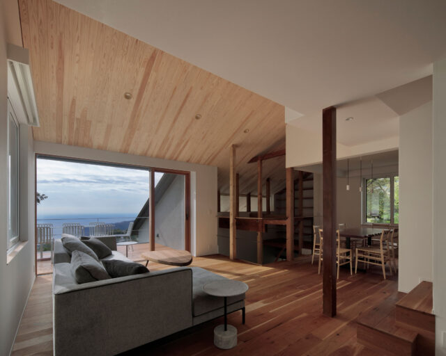 佐藤研也+笹本直裕 / studio nikoによる、宮城・仙台市の「南中山の家」。メーカーのプレファブ住宅を改修。“そこにしかない”存在への変換を目指し、既存構造の特性を活かして一室空間の中に様々な活動の場所を構築。新設の階段で流動性を生み出して建築に“移動と滞留”の楽しさも付与 吹き抜け photo©高野ユリカ
