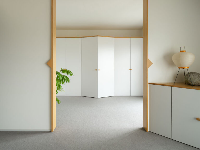 山村健+ナタリア サンツ・ラヴィーニャ / YSLA Architectsによる、東京・狛江市の住戸改修「MASAKO HOUSE」。単身高齢者の為に計画。施主が重視する“飲食・読書・運動”を尊重する住居を目指し、各空間を個別に設けつつも全体が一室となり“広がり”を生む構成を考案。各所の“三角”は機能性と意匠的抑揚の役割を担う 寝室収納 photo©小野寺宗貴